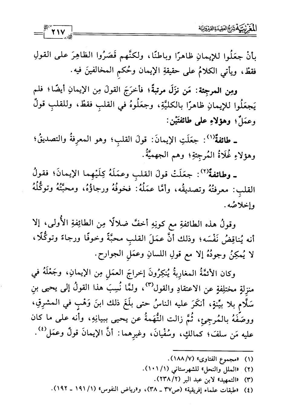 وكان الأئمَّةُ المغارِبةُ يُنكِرُونَ إخراجَ العمَلِ مِن الإيمان، وجَعْلَهُ في منزِلةٍ مختلِفةٍ عن الاعتقادِ والقول (٣)، ولمَّا نُسِبَ هذا القولُ إلى يحيى بنِ سَلَّامٍ بلا بيِّنةٍ، أنكَرَ عليه الناسُ حتى بلَغَ ذلك ابنَ وَهْبٍ في المشرِقِ، ووصَفَهُ بالمُرجِئ، ثُمَّ زالت التُّهَمةُ عن يحيى ببيانِه، وأنه على ما كان عليه مَن سلفَ؛ كمالكٍ، وسُفْيانَ، وغيرِهما: أنَّ الإيمانَ قولٌ وعمَل (٤).
