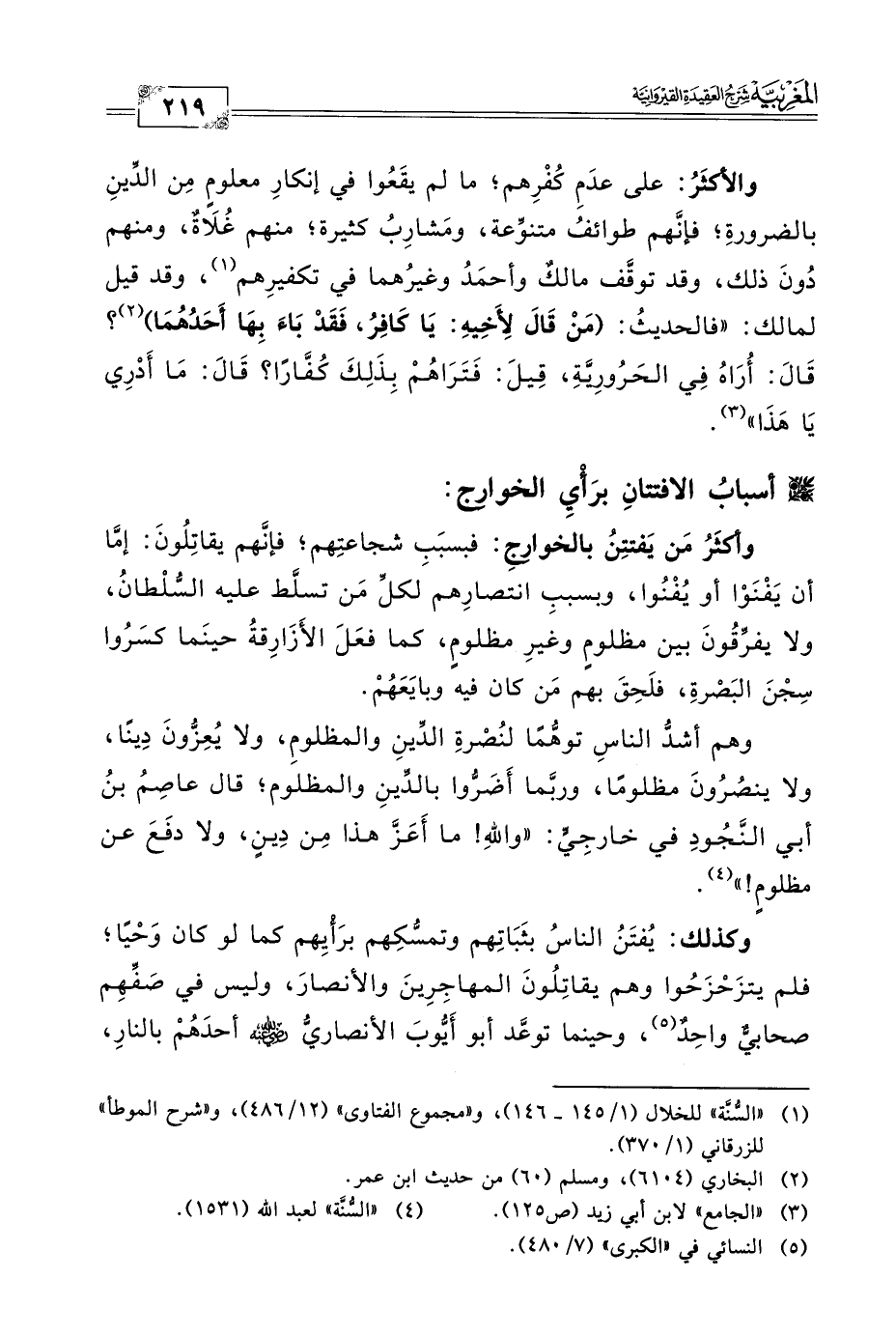 والأكثَرُ: على عدَمِ كُفْرِهم؛ ما لم يقَعُوا في إنكارِ معلوم مِن الدِّينِ بالضرورةِ؛ فإنَّهم طوائفُ متنوِّعة، ومَشارِبُ كثيرة؛ منهم غُلَاةٌ، ومنهم دُونَ ذلك، وقد توقَّف مالكٌ وأحمَدُ وغيرُهما في تكفيرِهم (١)، وقد قيل لمالك: "فالحديثُ: (مَنْ قَالَ لِأَخِيهِ: يَا كَافِرُ، فَقَدْ بَاءَ بِهَا أَحَدُهُمَا) (٢)؟ قَالَ: أُرَاهُ فِي الحَرُورِيَّة، قِيلَ: فَتَرَاهُمْ بِذَلِكَ كُفَّارًا؟ قَالَ: مَا أَدْرِي يَا هَذَا" (٣).
