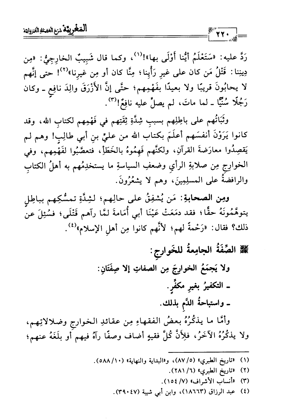 وأمَّا ما يذكُرُهُ بعضُ الفقهاءِ مِن عقائدِ الخوارجِ وضلالاتِهم، ولا يذكُرُهُ الآخَرُ، فلِأَنَّ كُلَّ فقيهٍ أضاف وصفًا رآهُ فيهم أو بلَغَهُ عنهم؛