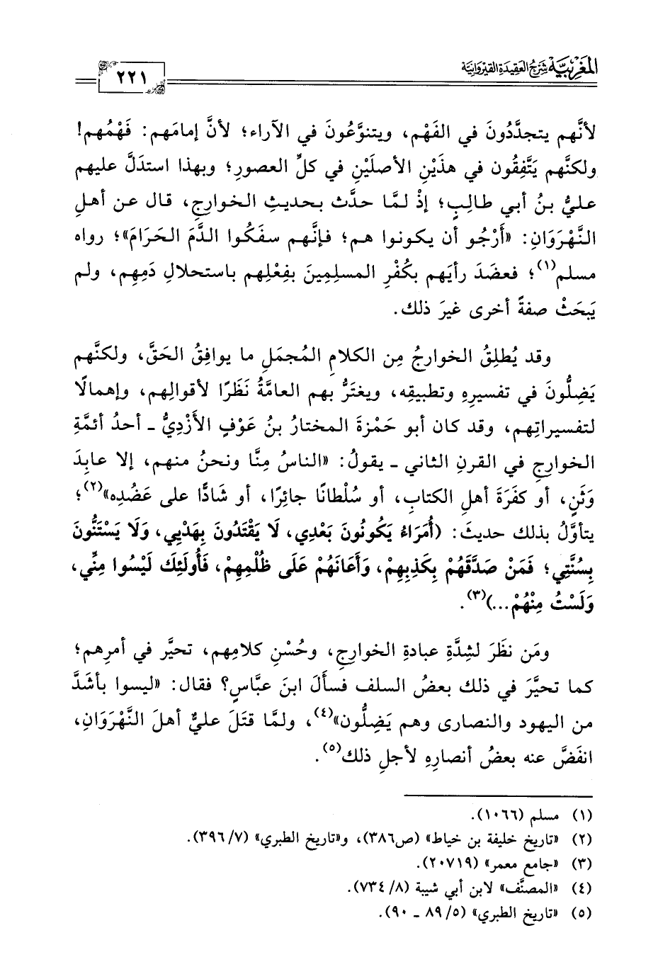 ومَن نظَرَ لشِدَّةِ عبادةِ الخوارِجِ، وحُسْنِ كلامِهم، تحيَّر في أمرِهم؛ كما تحيَّرَ في ذلك بعضُ السلف فسأَلَ ابنَ عبَّاسٍ؟ فقال: "ليسوا بأشَدَّ من اليهود والنصارى وهم يَضِلُّون" (٤)، ولمَّا قتَلَ عليٌّ أهلَ النَّهْرَوَانِ، انفَضَّ عنه بعضُ أنصارِهِ لأجلِ ذلك (٥).
