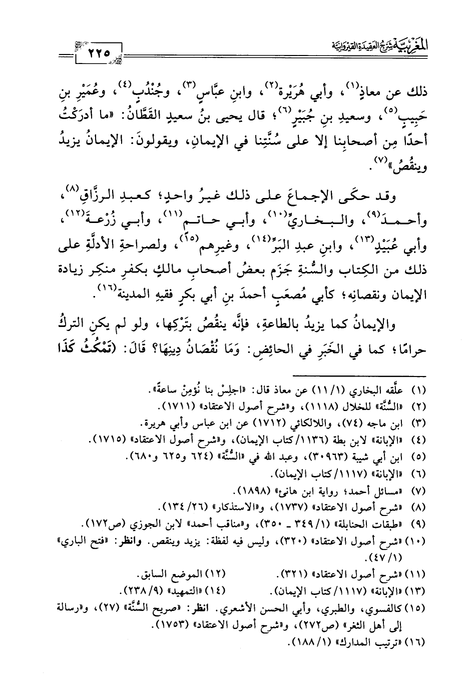 وقد حكَى الإجماعَ على ذلك غيرُ واحدٍ؛ كعبدِ الرزَّاقِ (٨)، وأحمدَ (٩)، والبخاريِّ (١٠)، وأبي حاتمٍ (١١)، وأبي زُرْعةَ (١٢)، وأبي عُبَيْدٍ (١٣)، وابنِ عبد البَرِّ (١٤)، وغيرِهم (١٥)، ولصراحةِ الأدلَّةِ على ذلك من الكِتاب والسُّنةِ جَزَم بعضُ أصحابِ مالكٍ بكفرِ منكِر زيادة الإيمان ونقصانِه؛ كأبي مُصعَبٍ أحمدَ بنِ أبي بكرٍ فقيهِ المدينة (١٦).