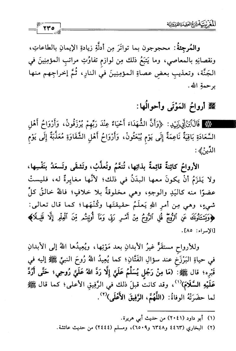 * قَالَ ابْنُ أَبي زَيْدٍ: (وَأَنَّ الشُّهَدَاءَ أَحْيَاءٌ عِنْدَ رَبِّهِمْ يُرْزَقُونْ، وَأَرْوَاحُ أَهْلِ السَّعَادَةِ بَاقِيَةٌ نَاعِمَةٌ إِلَى يَوْمِ يُبْعَثُونْ، وَأَرْوَاحُ أَهْلِ الشَّقَاوَةِ مُعَذَّبَةٌ إِلَى يَوْمِ الدِّينْ):