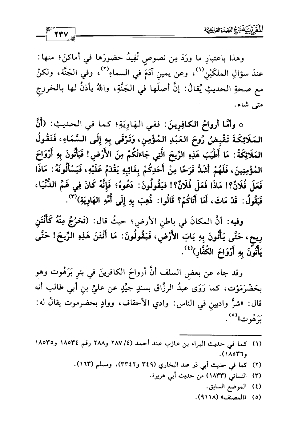 وقد جاء عن بعضِ السلف أنَّ أرواحَ الكافرينَ في بئرِ بَرَهُوت وهو بحَضْرَمَوْت، كما رَوَى عبدُ الرزَّاق بسندٍ جيَّدٍ عن عليِّ بنِ أبي طالب أنه قال: "شرُّ واديينِ في الناس: وادي الأحقاف، ووادٍ بحضرموت يقالُ له: بَرَهُوت" (٥).