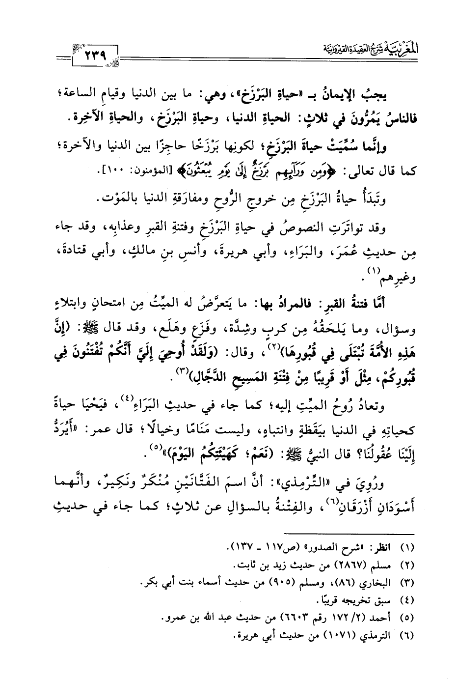 يجبُ الإيمانُ بـ "حياةِ البَرْزَخ"، وهي: ما بين الدنيا وقيامِ الساعة؛ فالناسُ يَمُرُّونَ في ثلاثٍ: الحياةِ الدنيا، وحياةِ البَرْزَخ، والحياةِ الآخِرة.