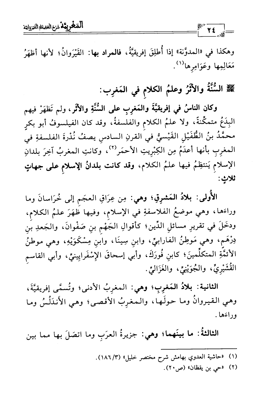 وكان الناسُ في إفريقيَّةَ والمَغرِبِ على السُّنَّةِ والأثَر، ولمْ تَظهَرْ فيهم البِدَعُ متمكِّنةً، ولا علمُ الكلامِ والفلسفةُ، وقد كان الفيلسوفُ أبو بكرٍ محمَّدُ بنُ الطُّفَيْلِ القَيْسيُّ في القرنِ السادسِ يصفُ نُدْرةَ الفلسفةِ في المغرِبِ بأنها أعدَمُ مِن الكِبْرِيتِ الأحمَر (٢)، وكانتِ المغربُ آخِرَ بلدانِ الإسلامِ يَنتظِمُ فيها علمُ الكلام، وقد كانت بلدانُ الإسلامِ على جهاتٍ ثلاثٍ: