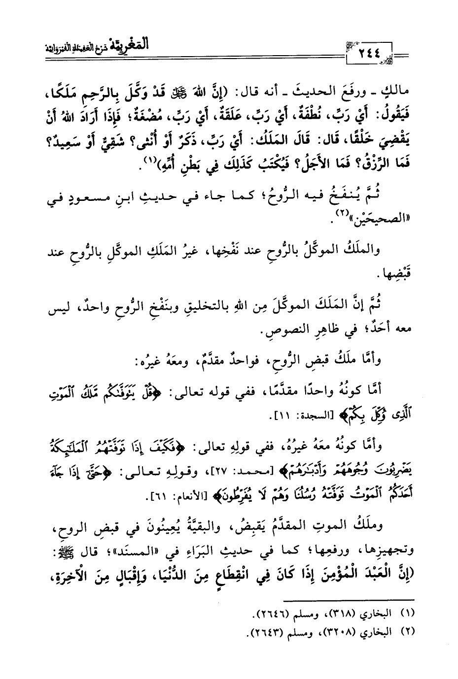 مالكٍ -ورفَعَ الحديثَ- أنه قال: (إِنَّ اللهَ -عز وجل- قَدْ وَكَّلَ بِالرَّحِمِ مَلَكًا، فَيَقُولُ: أَيْ رَبِّ، نُطْفَةٌ؛ أَيْ رَبِّ، عَلَقَةٌ، أَيْ رَبِّ، مُضْغَةٌ؛ فَإِذَا أَرَادَ اللهُ أَنْ يَقْضِيَ خَلْقًا، قَال: قَالَ المَلَكُ: أَيْ رَبِّ، ذَكَرٌ أَو أُنْثى؟ شَقِيٌّ أَو سَعِيدٌ؟ فَمَا الرَّزْقُ؟ فَمَا الأَجَلُ؟ فَيُكْتَبُ كَذَلِكَ في بَطْنِ أُمِّهِ) (١).