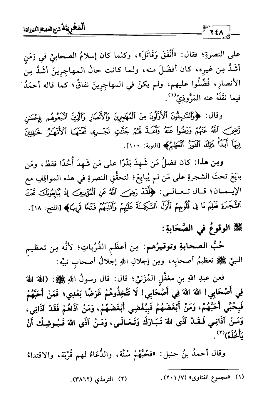 فعن عبد اللهِ بنِ مغفَّلٍ المُزَنيِّ؛ قال: قال رسولُ اللهِ -صلى الله عليه وسلم-: (اللهَ اللهَ فِي أَصْحَابِي! اللهَ اللهَ فِي أَصْحَابِي! لَا تَتَّخِذُوهُمْ غَرَضًا بَعْدِي؛ فَمَنْ أَحَبَّهُمْ فَبِحُبِّي أَحَبِّهُمْ، وَمَنْ أَبْغَضَهُمْ فَبِبُغْضِي أَبْغَضَهُمْ، وَمَنْ آذَاهُمْ فَقَدْ آذَانِي، وَمَنْ آذَانِي فَقَدْ آذَى اللهَ تَبَارَكَ وَتَعَالَى، وَمَنْ آذَى اللهَ فَيُوشِكُ أنْ يَأْخُذَهُ) (٢).