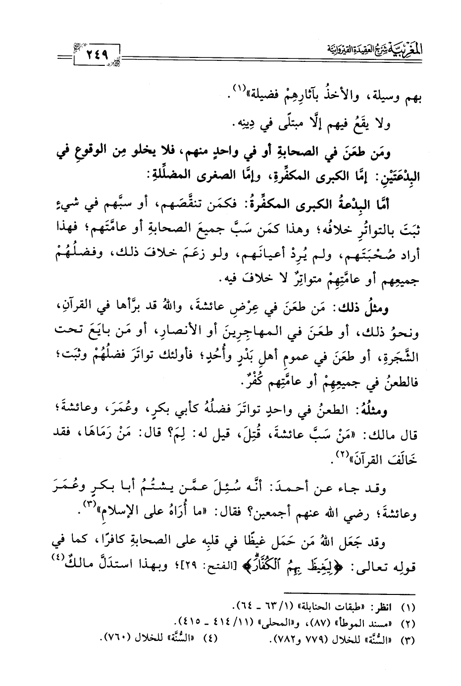 أمَّا البِدْعةُ الكبرى المكفِّرةُ: فكمَن تنقَّصَهم، أو سبَّهم في شيءٍ ثبَتَ بالتواتُرِ خلافُه؛ وهذا كمَن سَبَّ جميعَ الصحابةِ أو عامَّتَهم؛ فهذا أراد صُحْبَتَهم، ولم يُرِدْ أعيانَهم، ولو زعَمَ خلافَ ذلك، وفضلُهُمْ جميعِهم أو عامَّتِهِمْ متواتِرٌ لا خلافَ فيه.