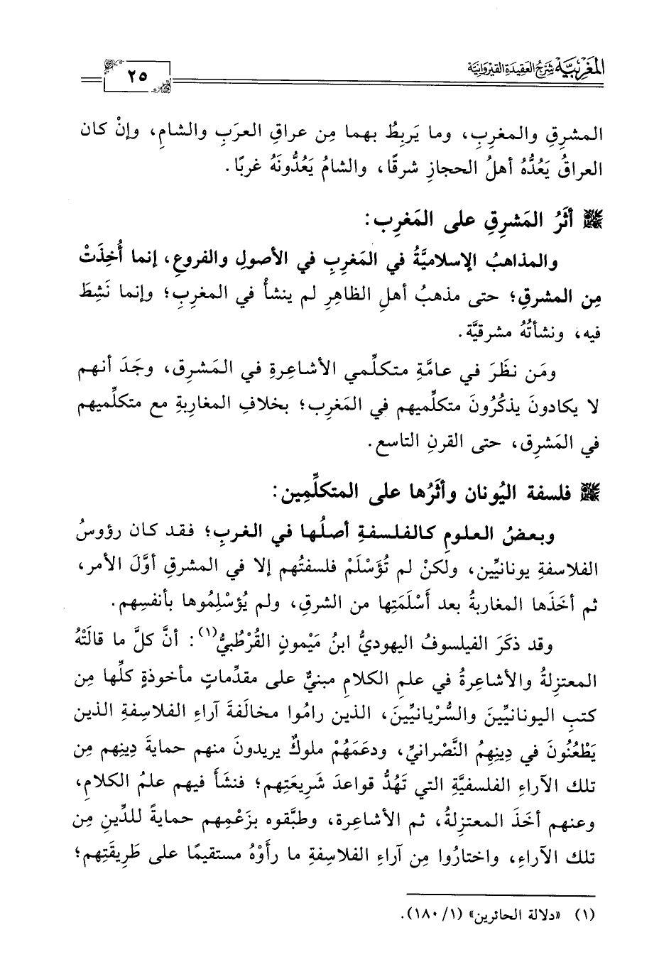ومَن نظَرَ في عامَّةِ متكلِّمي الأشاعِرةِ في المَشرِق، وجَدَ أنهم لا يكادونَ يذكُرُونَ متكلِّميهم في المَغرِب؛ بخلافِ المغارِبةِ مع متكلِّميهم في المَشرِق، حتى القرنِ التاسع.