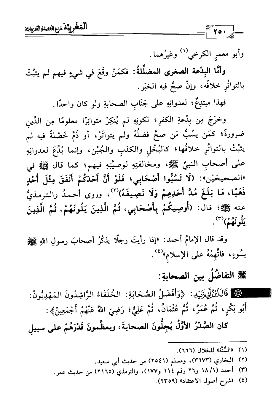 وخرَجَ مِن بِدْعةِ الكفرِ؛ لكونِهِ لم يُنكِرْ متواتِرًا معلومًا مِن الدِّينِ ضرورةً؛ كمَن يسُبُّ مَن صحَّ فضلُهُ ولم يتواتَرْ، أو ذَمَّ خَصْلةً فيه لم يثبُتْ بالتواتُرِ خلافُها؛ كالبُخْلِ والكذبِ والجُبْن، وإنما بُدِّعَ لعدوانِهِ على أصحابِ النبيِّ -صلى الله عليه وسلم-، ومخالفتِهِ لوصيَّتِهِ فيهم؛ كما قال -صلى الله عليه وسلم- في "الصحيحَيْن": (لَا تَسُبُّوا أصْحَابِي؛ فَلَوْ أَنَّ أَحَدَكُمْ أَنْفَقَ مِثْلَ أحُدٍ ذَهَبًا، مَا بَلَغَ مُدَّ أَحَدِهِمْ وَلَا نَصِيفَهُ) (٢)، وروى أحمدُ والترمذيُّ عنه -صلى الله عليه وسلم-؛ قال: (أُوصِيكُمْ بِأَصْحَابِي، ثُمَّ الَّذِينَ يَلُونَهُمْ، ثُمَّ الَّذِينَ يَلُونَهُمْ) (٣).