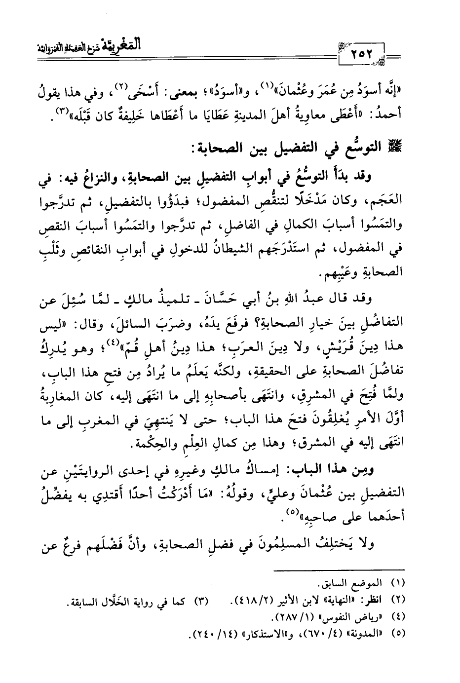 وقد قال عبدُ اللهِ بن أبي حَسَّانَ -تلميذُ مالكٍ- لمَّا سُئِلَ عن التفاضُلِ بينَ خيارِ الصحابةِ؟ فرفَعَ يدَهُ، وضرَبَ السائلَ، وقال: "ليس هذا دِينَ قُرَيْشٍ، ولا دِينَ العرَبِ؛ هذا دِينُ أهلِ قُمّ" (٤)؛ وهو يُدرِكُ تفاضُلَ الصحابةِ على الحقيقةِ، ولكنَّه يَعلَمُ ما يُرادُ مِن فتحِ هذا البابِ، ولمَّا فُتِحَ في المشرِق، وانتَهَى بأصحابِهِ إلى ما انتَهَى إليه، كان المغارِبةُ أوَّلَ الأمرِ يُغلِقُونَ فتحَ هذا الباب؛ حتى لا يَنتهِيَ في المغربِ إلى ما انتَهَى إليه في المشرق؛ وهذا مِن كمالِ العِلْمِ والحِكْمة.