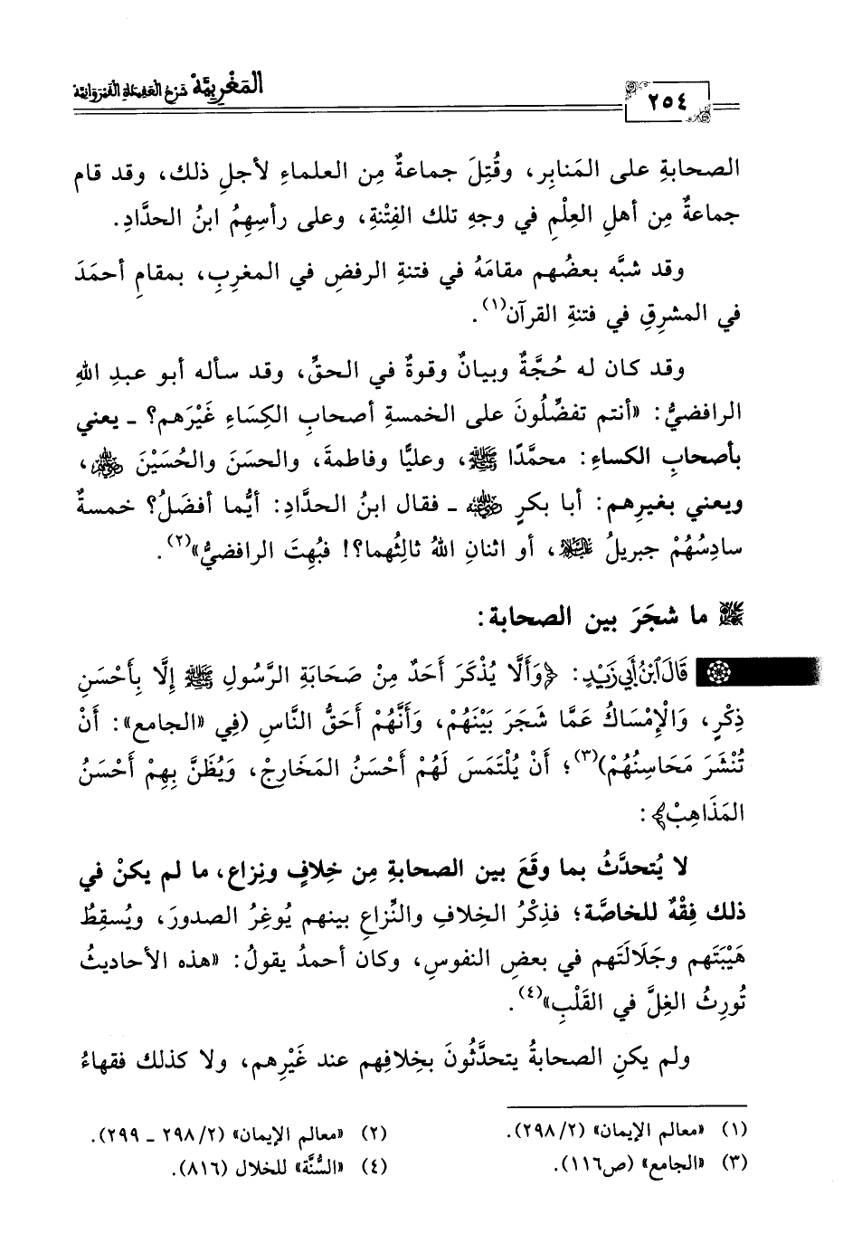الصحابةِ على المَنابِر، وقُتِلَ جماعةٌ مِن العلماءِ لأجلِ ذلك، وقد قام جماعةٌ مِن أهلِ العِلْمِ في وجهِ تلك الفِتْنةِ، وعلى رأسِهِمُ ابنُ الحدَّادِ.