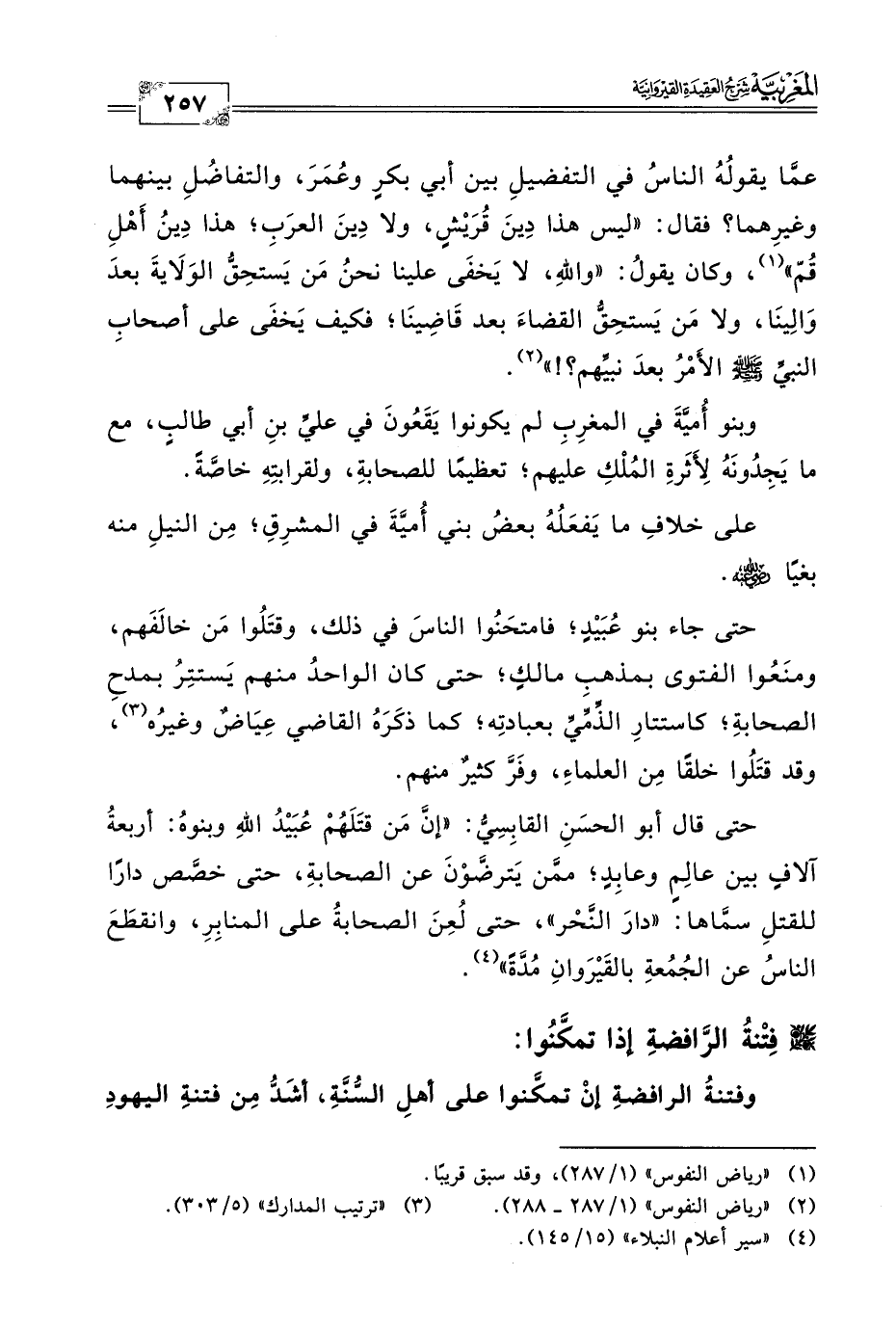 حتى جاء بنو عُبَيْدٍ؛ فامتحَنُوا الناسَ في ذلك، وقتَلُوا مَن خالَفَهم، ومنَعُوا الفتوى بمذهبِ مالكٍ؛ حتى كان الواحدُ منهم يَستتِرُ بمدحِ الصحابةِ؛ كاستتارِ الذِّمِّيِّ بعبادتِه؛ كما ذكَرَهُ القاضي عِيَاضٌ وغيرُه (٣)، وقد قتَلُوا خلقًا مِن العلماءِ، وفَرَّ كثيرٌ منهم.
