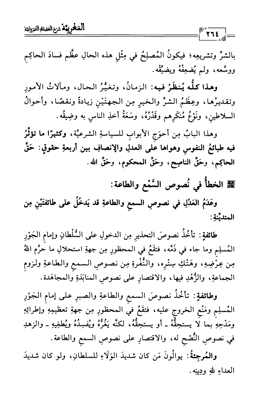 وطائفةٍ: تأخُذُ نصوصَ السمعِ والطاعةِ والصبرِ على إمامِ الجَوْرِ المُسلِمِ ومَنْعِ الخروجِ عليه، فتقَعُ في المحظورِ مِن جهةِ تعظيمِهِ وإطرائِهِ ومَدْحِهِ بما لا يستحِقُّهُ -أو يستحِقُّهُ، لكنَّه يَغُرُّهُ ويُفسِدُهُ ويُطغِيهِ- والزهدِ في نصوصِ النُّصْحِ له، والاقتصارِ على نصوصِ السمعِ والطاعة.
