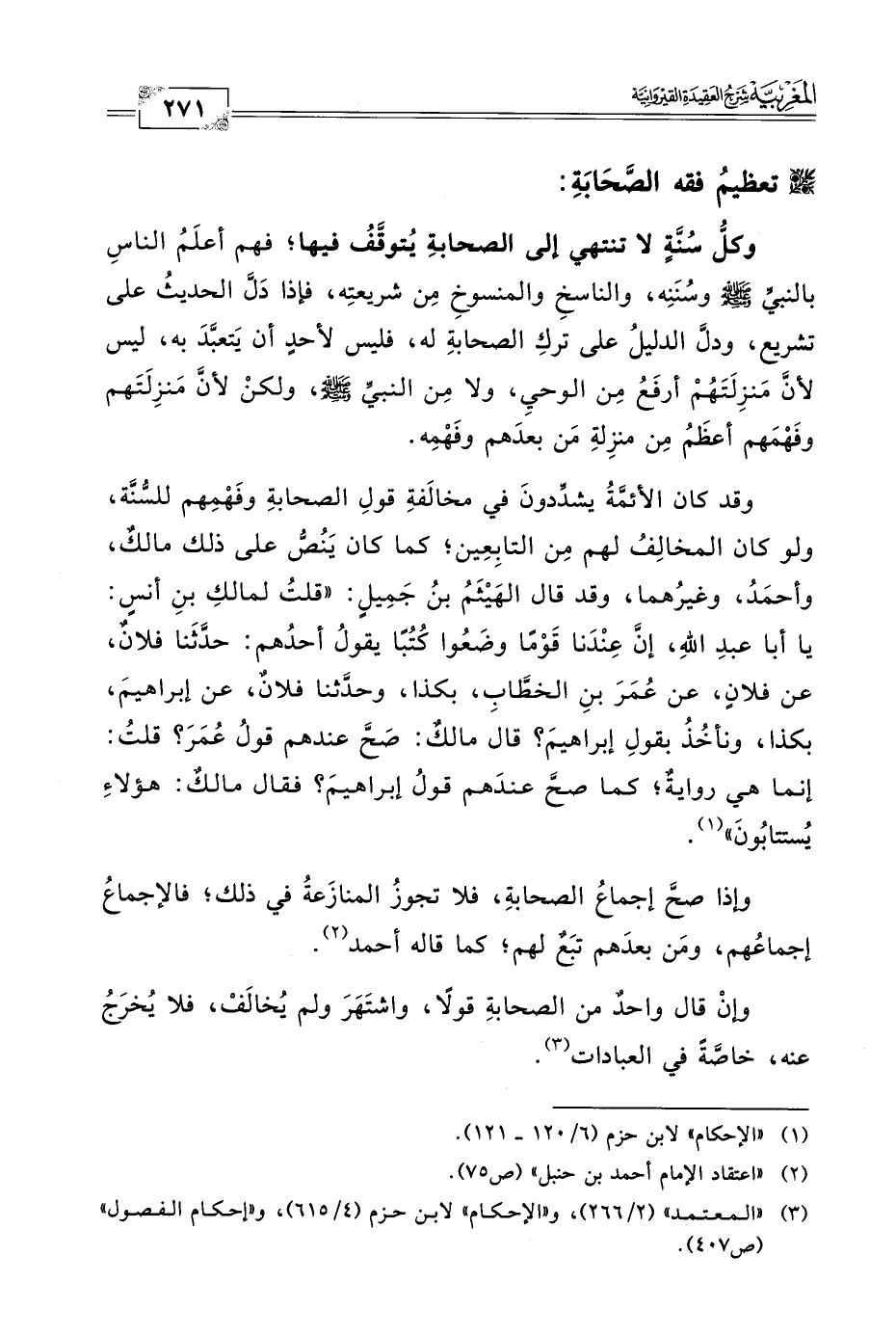 وقد كان الأئمَّةُ يشدِّدونَ في مخالَفةِ قولِ الصحابةِ وفَهْمِهم للسُّنَّة، ولو كان المخالِفُ لهم مِن التابِعِين؛ كما كان يَنُصُّ على ذلك مالكٌ، وأحمَدُ، وغيرُهما، وقد قال الهَيْثَمُ بنُ جَمِيلٍ: "قلتُ لمالكِ بنِ أنسٍ: يا أبا عبد اللهِ، إنَّ عِنْدَنا قَوْمًا وضَعُوا كُتُبًا يقولُ أحدُهم: حدَّثَنا فلانٌ، عن فلانٍ، عن عُمَرَ بنِ الخطَّابِ، بكذا، وحدَّثنا فلانٌ، عن إبراهيمَ، بكذا، ونأخُذُ بقولِ إبراهيمَ؟ قال مالكٌ: صَحَّ عندهم قولُ عُمَرَ؟ قلتُ: إنما هي روايةٌ؛ كما صحَّ عندَهم قولُ إبراهيمَ؟ فقال مالكٌ: هؤلاءِ يُستتابُونَ" (١).