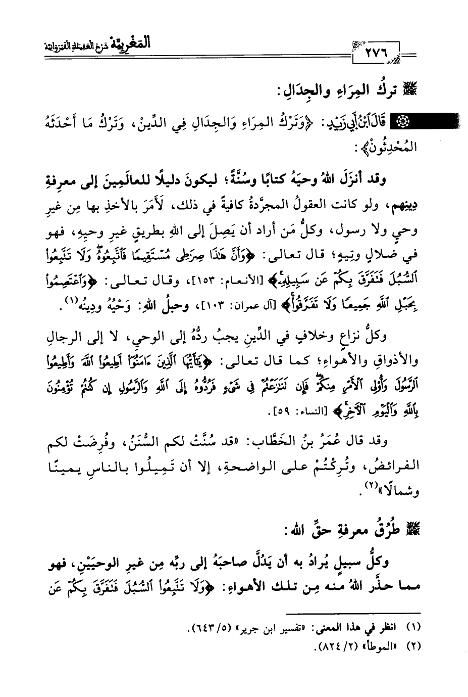 * قَالَ ابْنُ أَبي زَيْدٍ: (وَتَرْكُ المِرَاءِ وَالجِدَالِ فِي الدِّينْ، وَتَرْكُ مَا أَحْدَثَهُ المُحْدِثُونْ):