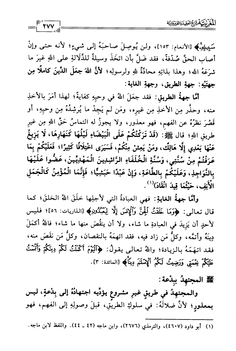 أمَّا جهةُ الطريقِ: فقد جعَلَ اللهُ في وحيِهِ كفايةً؛ لهذا أمَرَ بالأخذِ منه، وحذَّر مِن الأخذِ مِن غيرِه، ومَن لم يَجِدْ ما يُرشِدُهُ مِن وحيِهِ، أو قَصُرَ نظرُهُ عن الفهمِ، فهو معذور، ولا يجوزُ له التماسُ حَقِّ اللهِ مِن غيرِ طريقِ اللهِ؛ قال -صلى الله عليه وسلم-: (قَدْ تَرَكْتُكُمْ عَلَى الْبَيْضَاءِ لَيْلُهَا كَنَهَارِهَا، لَا يَزِيغُ عَنْهَا بَعْدِي إلَّا هَالِكٌ، ومَنْ يَعِشْ مِنْكُمْ، فَسَيَرَى اخْتِلَافًا كَثِيرًا؛ فَعَلَيْكُمْ بِمَا عَرَفْتُمْ مِنْ سُنَّتِي، وَسُنَّةِ الْخُلَفَاءِ الرَّاشِدِينَ الْمَهْدِيِّينَ، عَضُّوا عَلَيْهَا بِالنَّوَاجِذِ، وَعَلَيْكُمْ بِالطَّاعَةِ، وَإِنْ عَبْدًا حَبَشِيًّا؛ فَإِنَّمَا الْمُؤْمِنُ كَالْجَمَلِ الْأَنِفِ، حَيْثُمَا قِيدَ انْقَادَ) (١).