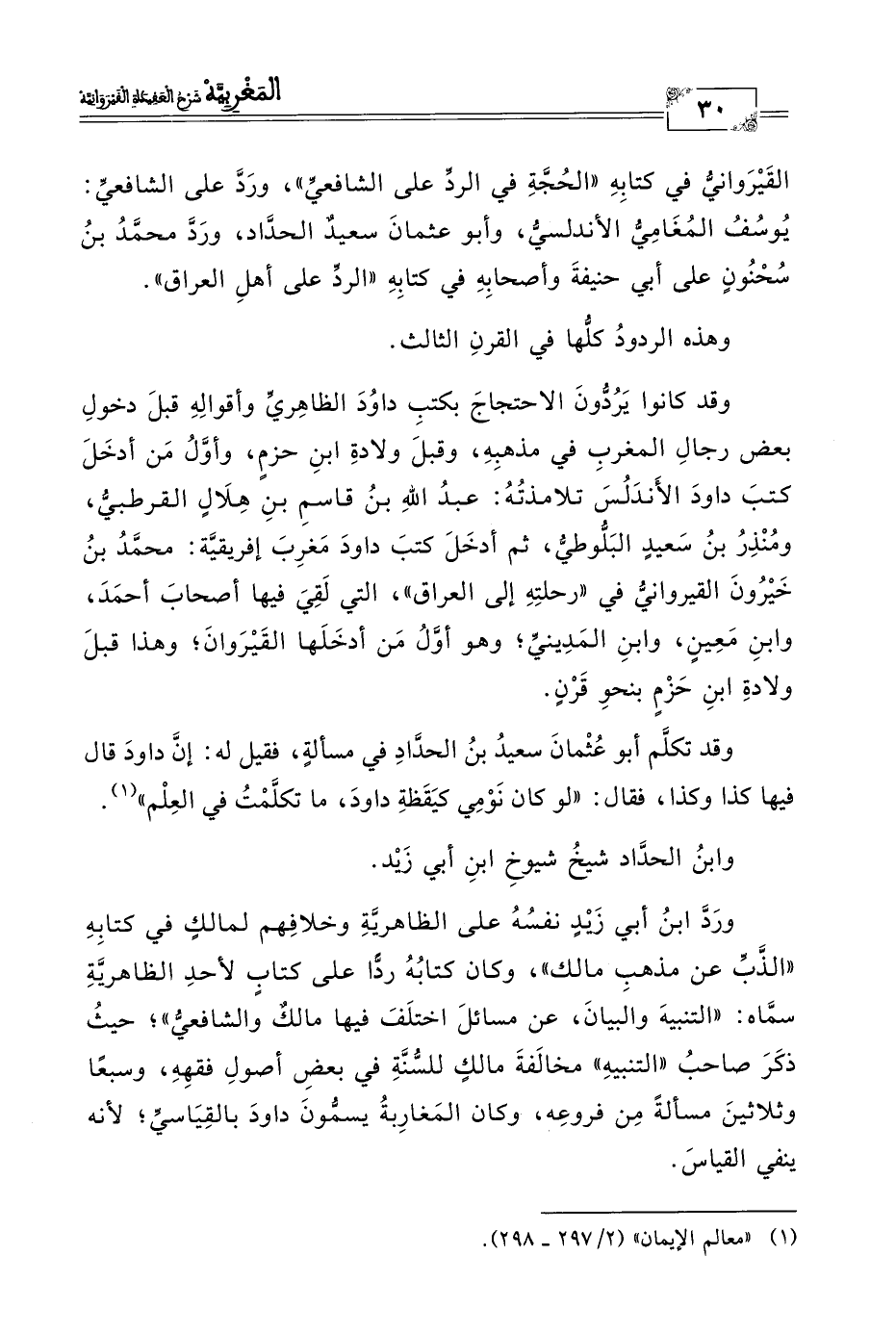 وقد كانوا يَرُدُّونَ الاحتجاجَ بكتبِ داوُدَ الظاهِريِّ وأقوالِهِ قبلَ دخولِ بعض رجالِ المغربِ في مذهبِه، وقبلَ ولادةِ ابنِ حزمٍ، وأوَّلُ مَن أدخَلَ كتبَ داودَ الأَندَلُسَ تلامذتُهُ: عبدُ اللهِ بن قاسمِ بنِ هِلَالٍ القرطبيُّ، ومُنْذِرُ بن سَعيدٍ البَلُّوطيُّ، ثم أدخَلَ كتبَ داودَ مَغرِبَ إفريقيَّة: محمَّدُ بن خَيْرُونَ القيروانيُّ في "رحلتِهِ إلى العراق"، التي لَقِيَ فيها أصحابَ أحمَدَ، وابنِ مَعِينٍ، وابنِ المَدِينيِّ؛ وهو أوَّلُ مَن أدخَلَها القَيْرَوانَ؛ وهذا قبلَ ولادةِ ابنِ حَزْمٍ بنحوِ قَرْنٍ.