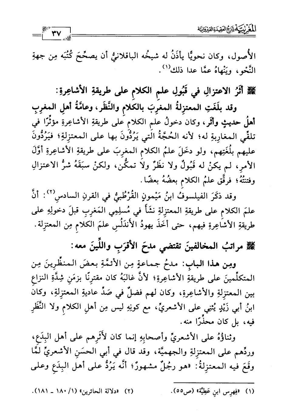 وقد بلَغَتِ المعتزِلةُ المغرِبَ بالكلامِ والنَّظَر، وعامَّةُ أهلِ المغرِبِ أهلُ حديثٍ وأثَر، وكان دخولُ علمِ الكلامِ على طريقةِ الأشاعِرةِ مؤثِّرًا في تلقِّي المغارِبةِ له؛ لأنه الحُجَّةُ التي يَرُدُّونَ بها على المعتزِلةِ؛ فيَرُدُّونَ عليهم بلُغَتِهم، ولو دخَلَ علمُ الكلامِ المغرِبَ على طريقةِ الأشاعِرةِ أوَّلَ الأمرِ، لم يكنْ له قَبُولٌ ولا نظَرٌ ولا تمكُّن، ولكنْ سبَقَهُ شرُّ الاعتزالِ وفتنتُهُ؛ فرقَّق علمُ الكلامِ بعضُهُ بعضًا.