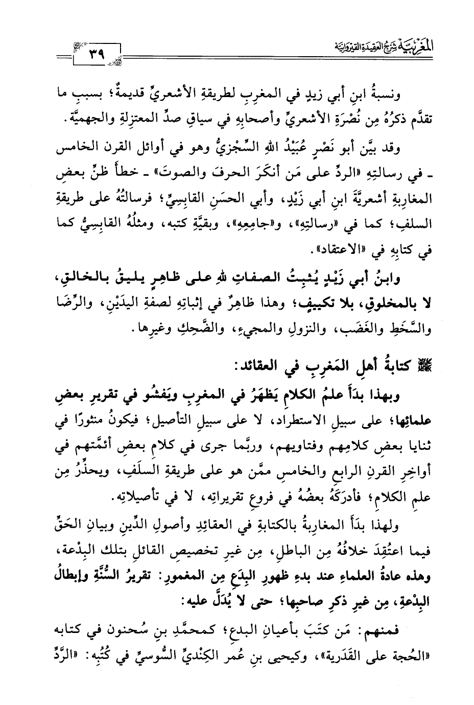 وقد بيَّن أبو نَصْرٍ عُبَيْدُ اللهِ السِّجْزيُّ وهو في أوائل القرن الخامس -في رسالتِهِ "الردِّ على مَن أنكَرَ الحرفَ والصوتَ"- خطأ ظنِّ بعضِ المغارِبةِ أشعريَّةَ ابنِ أبي زَيْدٍ، وأبي الحسَنِ القابِسِيِّ؛ فرسالتُهُ على طريقةِ السلفِ؛ كما في "رسالتِهِ"، و"جامِعِهِ"، وبقيَّةِ كتبه، ومثلُهُ القابِسِيُّ كما في كتابِهِ في "الاعتقاد".