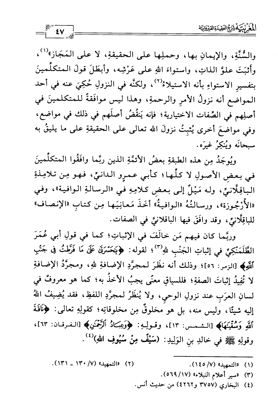 ويُوجَدُ مِن هذه الطبقةِ بعضُ الأئمَّةِ الذين ربَّما وافَقُوا المتكلِّمينَ في بعضِ الأصولِ لا كلِّها؛ كأبي عمرٍو الدانيِّ، فهو مِن تلامِذةِ الباقِلَّانيُّ، وله مَيْلٌ إلى بعضِ كلامِهِ في "الرسالةِ الوافية"، وفي "الأُرْجُوزة"، ورسالتُهُ "الوافيةُ" أخَذَ مَعانِيَها مِن كتابِ "الإنصاف" للباقِلَّانيِّ، وقد وافَقَ فيها الباقلانيَّ في الصفات.