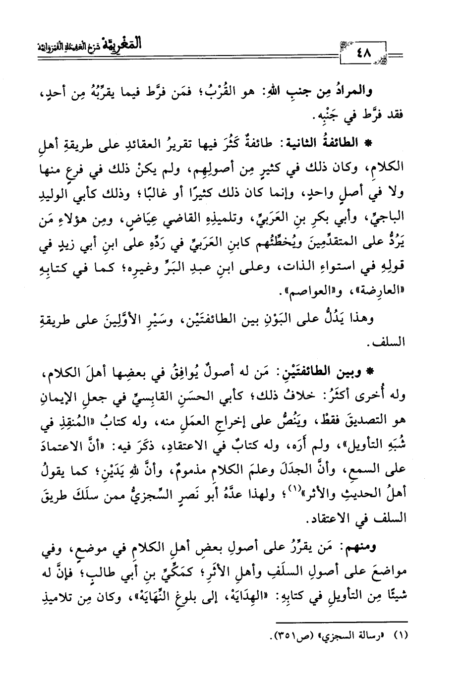 * وبين الطائفتَيْنِ: مَن له أصولٌ يُوافِقُ في بعضِها أهلَ الكلام، وله أُخرى أكثَرُ: خلافُ ذلك؛ كأبي الحسَنِ القابِسيِّ في جعلِ الإيمانِ هو التصديقَ فقطْ، ويَنُصُّ على إخراجِ العمَلِ منه، وله كتابُ "المُنقِذِ في شُبَهِ التأويل"، ولم أَرَه، وله كتابٌ في الاعتقاد، ذكَرَ فيه: "أنَّ الاعتمادَ على السمعِ، وأنَّ الجدَلَ وعلمَ الكلامِ مذمومٌ، وأنَّ للهِ يَدَيْنِ؛ كما يقولُ أهلُ الحديثِ والأثر" (١)؛ ولهذا عدَّهُ أبو نَصرٍ السِّجزيُّ ممن سلَكَ طريقَ السلف في الاعتقاد.