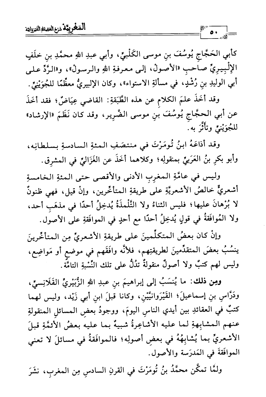 وليس في عامَّةِ المغرِبِ الأدنى والأقصى حتى المئةِ الخامسةِ أشعريٌّ خالصُ الأشعريَّةِ على طريقةِ المتأخِّرين، وإنْ قيل، فهي ظنونٌ لا بُرْهانَ عليها؛ فليس الثناءُ ولا التَّلْمذَةُ يُدخِلُ أحدًا في مذهَبِ أحد، ولا المُوافَقةُ في قولٍ يُدخِلُ أحدًا مع أحدٍ في الموافَقةِ على الأصول.