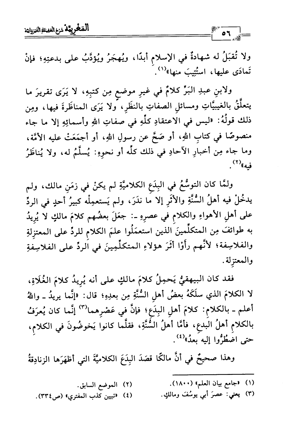 ولمَّا كان التوسُّعُ في البِدَع الكلاميَّةِ لم يكنْ في زمَنِ مالك، ولم يدخُلْ فيه أهلُ السُّنَّةِ والأثَرِ إلا ما ندَرَ، ولم يَستعمِلْه كبيرُ أحدٍ في الردِّ على أهلِ الأهواءِ والكلامِ في عصرِهِ-: جعَلَ بعضُهم كلامَ مالكٍ لا يُرِيدُ به طوائفَ مِن المتكلِّمينَ الذين استعمَلُوا علمَ الكلامِ للردِّ على المعتزِلةِ والفلاسِفة؛ لأنَّهم رأَوْا أثَرَ هؤلاءِ المتكلِّمِينَ في الردِّ على الفلاسِفةِ والمعتزِلة.