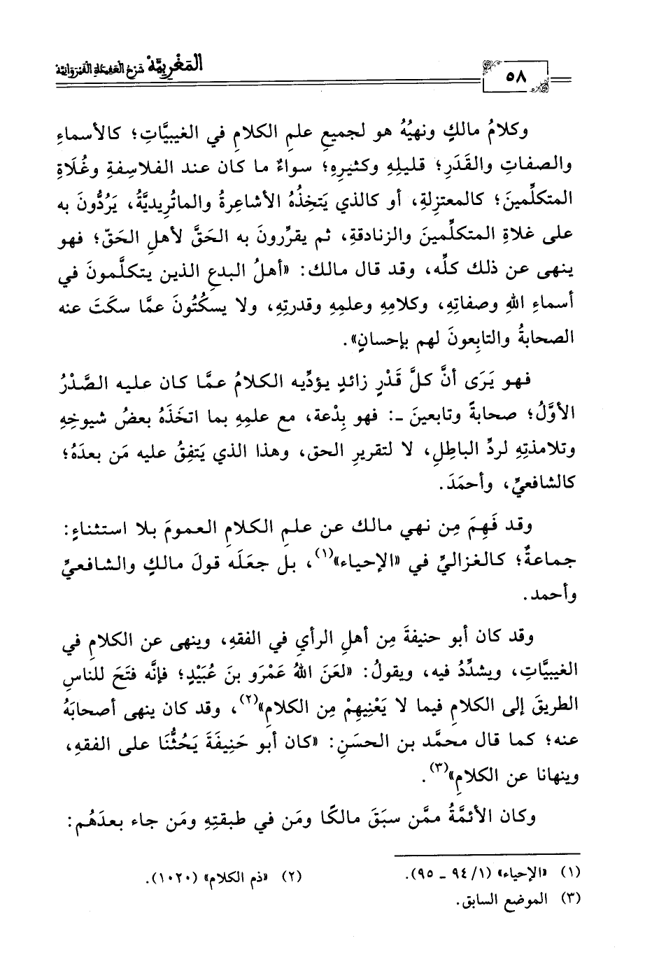 وكلامُ مالكٍ ونهيُهُ هو لجميعِ علمِ الكلامِ في الغيبيَّاتِ؛ كالأسماءِ والصفاتِ والقَدَرِ؛ قليلِهِ وكثيرِهِ؛ سواءٌ ما كان عند الفلاسِفةِ وغُلَاةِ المتكلِّمينَ؛ كالمعتزِلةِ، أو كالذي يَتخِذُهُ الأشاعِرةُ والماتُرِيديَّةُ، يَرُدُّونَ به على غلاةِ المتكلِّمينَ والزنادقةِ، ثم يقرِّرونَ به الحَقِّ لأهلِ الحَقّ؛ فهو ينهى عن ذلك كلِّه، وقد قال مالك: "أهلُ البدعِ الذين يتكلَّمونَ في أسماءِ اللهِ وصفاتِهِ، وكلامِهِ وعلمِهِ وقدرتِهِ، ولا يسكُتُونَ عمَّا سكَتَ عنه الصحابةُ والتابِعونَ لهم بإحسان".