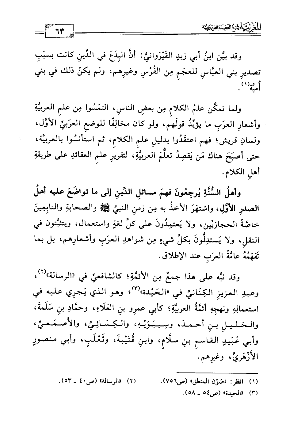 وقد نبَّه على هذا جمعٌ مِن الأئمَّةِ؛ كالشافعيِّ في "الرسالة" (٢)، وعبدِ العزيزِ الكِنَانيِّ في "الحَيْدة" (٣)؛ وهو الذي يَجرِي عليه في استعمالِهِ ونهجِهِ أئمَّةُ العربيَّةِ؛ كأبي عمرِو بنِ العَلَاءِ، وحمَّادِ بنِ سَلَمةَ، والخليلِ بنِ أحمدَ، وسِيبَوَيْهِ، والكِسَائِيِّ، والأَصمَعيِّ، وأبي عُبَيدٍ القاسمِ بنِ سلَّامٍ، وابنِ قُتَيْبةَ، وثَعْلَبٍ، وأبي منصورٍ الأَزْهَريِّ، وغيرِهم.
