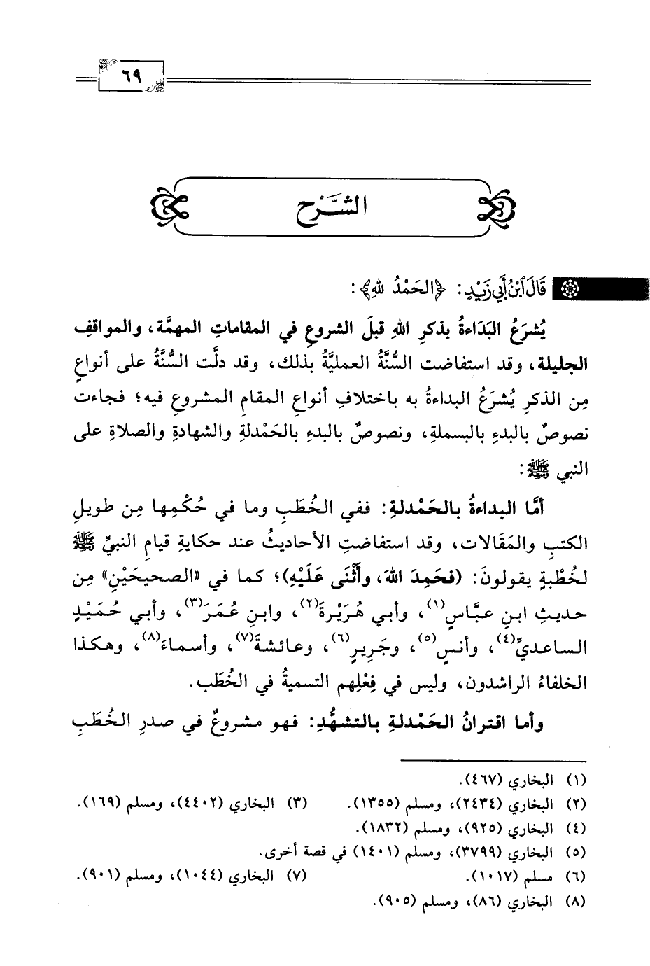أمَّا البداءةُ بالحَمْدلةِ: ففي الخُطَبِ وما في حُكْمِها مِن طويلِ الكتبِ والمَقَالات، وقد استفاضتِ الأحاديثُ عند حكايةِ قيامِ النبيِّ -صلى الله عليه وسلم- لخُطْبةٍ يقولونَ: (فحَمِدَ اللهَ، وأَثْنَى عَلَيْهِ)؛ كما في "الصحيحَيْنِ" مِن حديثِ ابنِ عبَّاسٍ (١)، وأبي هُرَيْرةَ (٢)، وابنِ عُمَرَ (٣)، وأبي حُمَيْدٍ الساعديِّ (٤)، وأنسٍ (٥)، وجَرِيرٍ (٦)، وعائشةَ (٧)، وأسماءَ (٨)، وهكذا الخلفاءُ الراشدون، وليس في فِعْلِهم التسميةُ في الخُطَب.