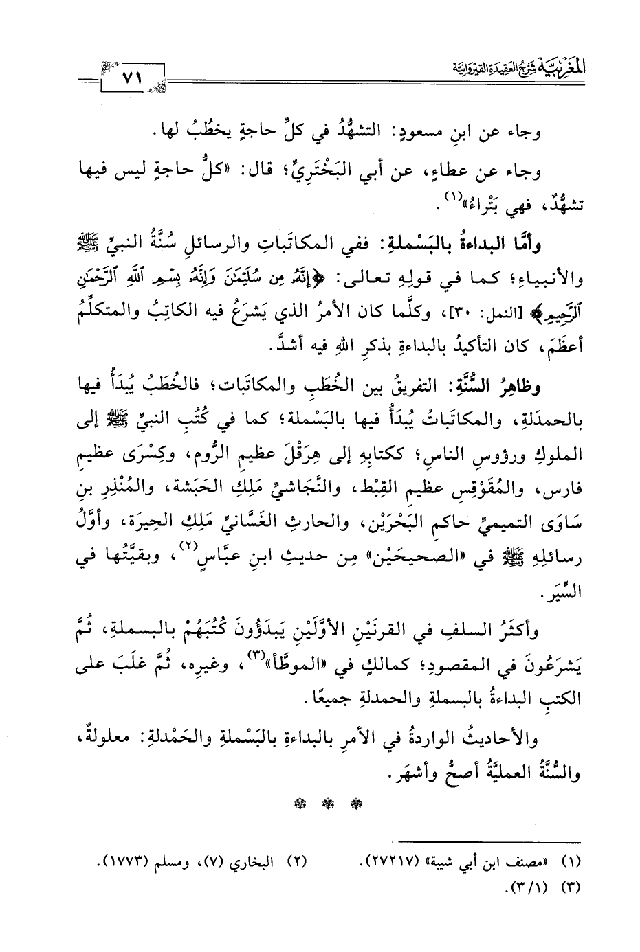 وأكثَرُ السلفِ في القرنَيْنِ الأوَّلَيْنِ يَبدَؤُونَ كُتُبَهُمْ بالبسملةِ، ثُمَّ يَشرَعُونَ في المقصودِ؛ كمالكٍ في "الموطَّأ" (٣)، وغيرِه، ثُمَّ غلَبَ على الكتبِ البداءةُ بالبسملةِ والحمدلةِ جميعًا.
