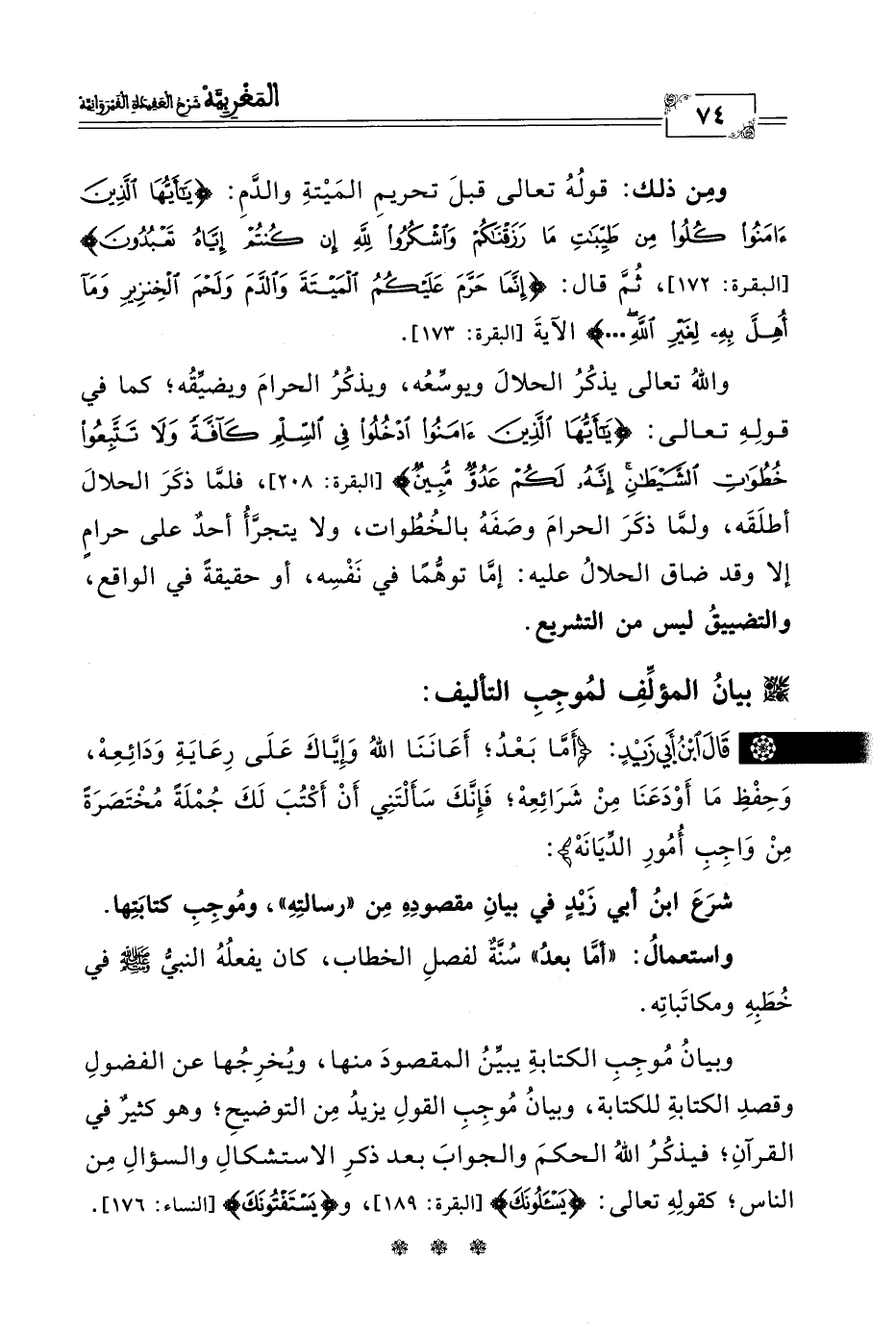 * قَالَ ابْنُ أَبي زَيْدٍ: (أَمَّا بَعْدُ؛ أَعَانَنَا اللهُ وَإِيَّاكَ عَلَى رِعَايَةِ وَدَائِعِهْ، وَحِفْظِ مَا أَوْدَعَنَا مِنْ شَرَائِعِهْ؛ فَإِنَّكَ سَأَلْتَنِي أَنْ أَكْتُبَ لَكَ جُمْلَةً مُخْتَصَرَةً مِنْ وَاجِبِ أُمُورِ الدِّيَانَهْ):