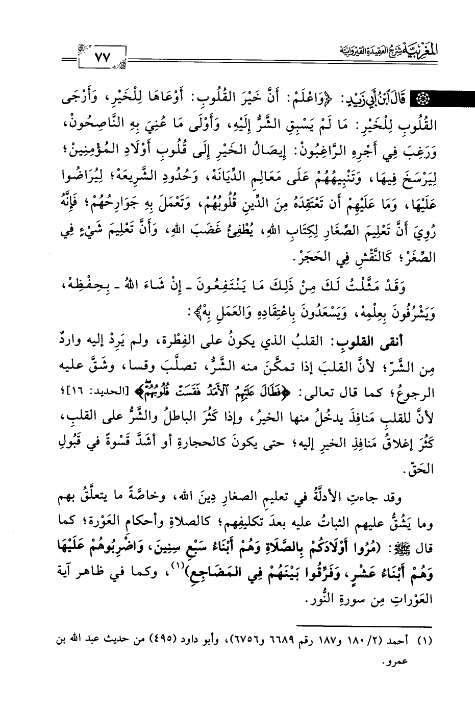 * قَالَ ابْنُ أَبي زَيْدٍ: (وَاعْلَمْ: أَنَّ خَيْرَ القُلُوبِ: أَوْعَاهَا لِلْخَيْر، وَأَرْجَى القُلُوبِ لِلْخَيْرِ: مَا لَمْ يَسْبِقِ الشَّرُّ إِلَيْهِ، وَأَوْلَى مَا عُنِيَ بِهِ النَّاصِحُونْ، وَرَغِبَ فِي أَجْرِهِ الرَّاغِبُونْ: إِيصَالُ الخَيْرِ إِلَى قُلُوبِ أَوْلَادِ المُؤْمِنِينْ؛ لِيَرْسَخَ فِيهَا، وَتَنْبِيهُهُمْ عَلَى مَعَالِمِ الدِّيَانَهْ، وَحُدُودِ الشَرِيعَهْ؛ لِيُرَاضُوا عَلَيْهَا، وَمَا عَلَيْهِمْ أَن تَعْتَقِدَهُ مِنَ الدِّينِ قُلُوبُهُمْ، وَتَعْمَلَ بِهِ جَوَارِحُهُمْ؛ فَإِنَّهُ رُوِيَ أَنَّ تَعْلِيمَ الصِّغَارِ لِكِتَابِ الله، يُطْفِئُ غَضَبَ الله، وَأَنَّ تَعْلِيمَ شَيءٍ فِي الصِّغَرْ؛ كَالنَّقْشِ فِي الحَجَرْ.