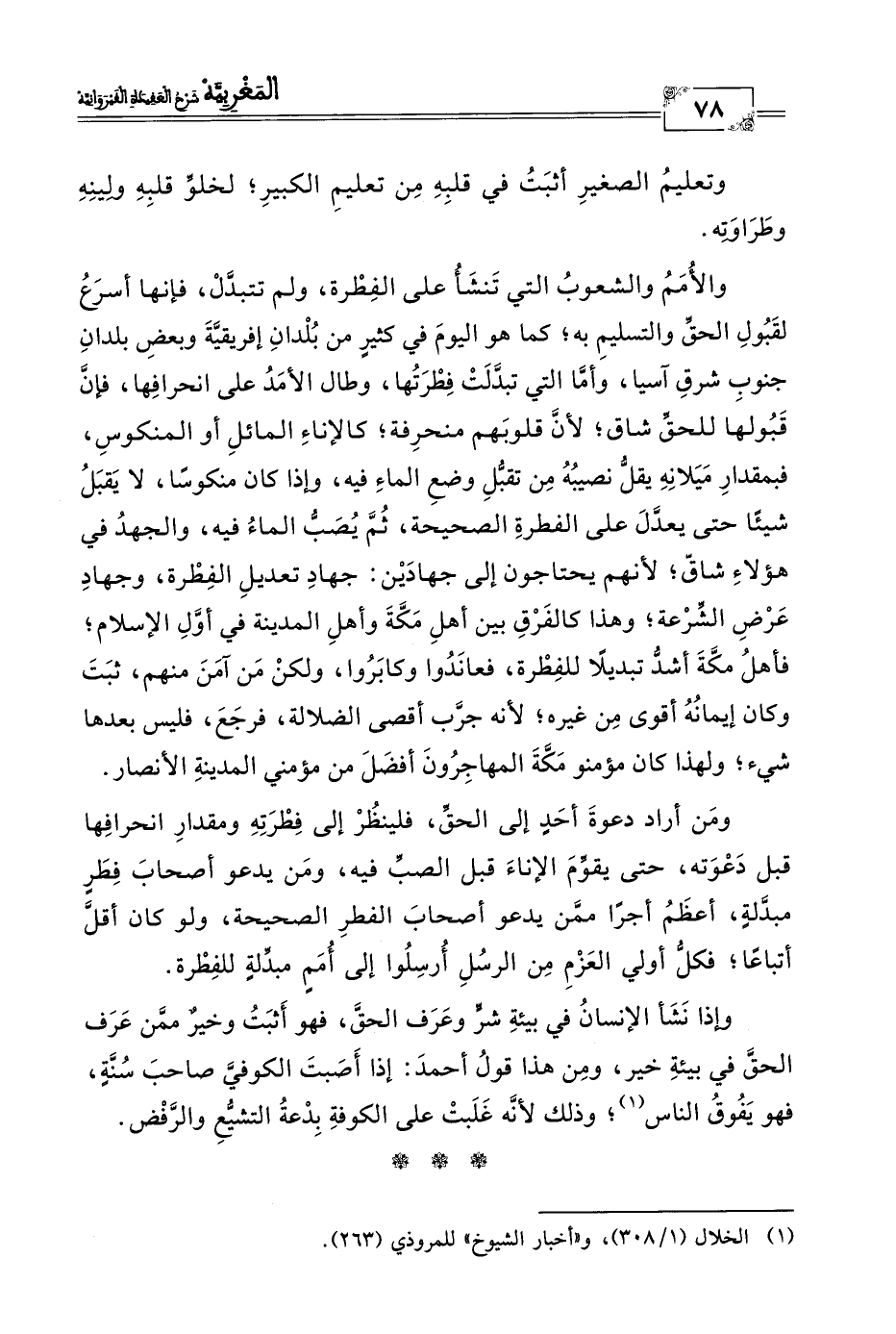 والأُمَمُ والشعوبُ التي تَنشَاُ على الفِطْرة، ولم تتبدَّلْ، فإنها أسرَعُ لقَبُولِ الحقِّ والتسليمِ به؛ كما هو اليومَ في كثيرِ من بُلْدانِ إفريقيَّةَ وبعضِ بلدانِ جنوبِ شرقِ آسيا، وأمَّا التي تبدَّلَتْ فِطْرَتُها، وطال الأمَدُ على انحرافِها، فإنَّ قَبُولها للحقِّ شاق؛ لأنَّ قلوبَهم منحرِفة؛ كالإناءِ المائلِ أو المنكوسِ، فبمقدارِ مَيَلانِهِ يقلُّ نصيبُهُ مِن تقبُّلِ وضعِ الماءِ فيه، وإذا كان منكوسًا، لا يَقبَلُ شيئًا حتى يعدَّلَ على الفطرةِ الصحيحة، ثُمَّ يُصَبُّ الماءُ فيه، والجهدُ في هؤلاءِ شاقّ؛ لأنهم يحتاجون إلى جهادَيْن: جهادِ تعديلِ الفِطْرة، وجهادِ عَرْضِ الشِّرْعة؛ وهذا كالفَرْقِ بين أهلِ مَكَّةَ وأهلِ المدينة في أوَّلِ الإسلام؛ فأهلُ مكَّةَ أشدُّ تبديلًا للفِطْرة، فعانَدُوا وكابَرُوا، ولكنْ مَن آمَنَ منهم، ثبَتَ وكان إيمانُهُ أقوى مِن غيره؛ لأنه جرَّب أقصى الضلالة، فرجَعَ، فليس بعدها شيء؛ ولهذا كان مؤمنو مَكَّةَ المهاجِرُونَ أفضَلَ من مؤمني المدينةِ الأنصار.