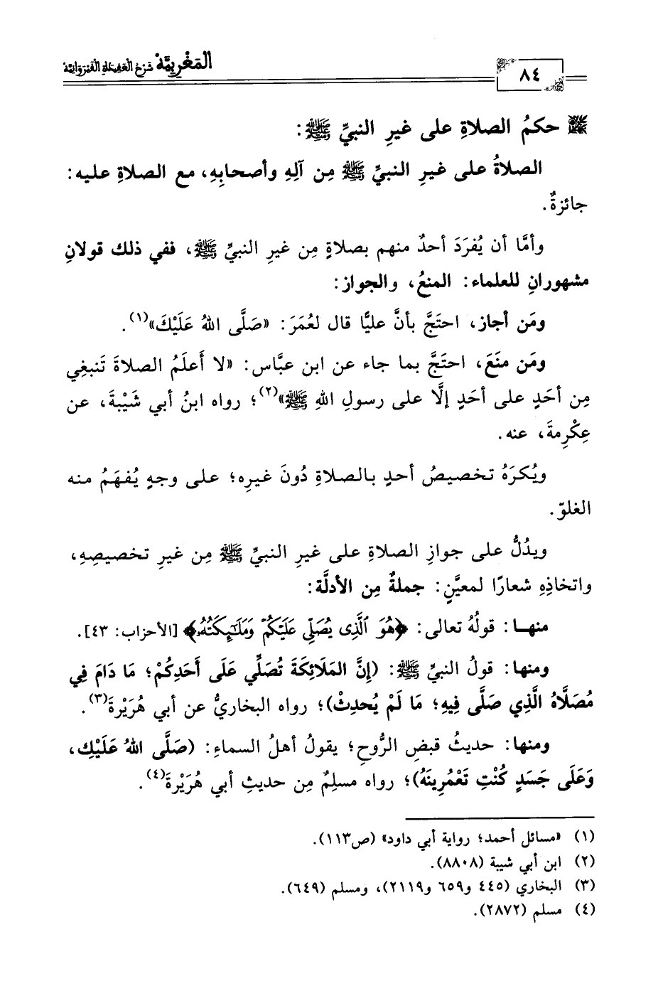 وأمَّا أن يُفرَدَ أحدٌ منهم بصلاةٍ مِن غيرِ النبيِّ -صلى الله عليه وسلم-، ففي ذلك قولانِ مشهورانِ للعلماء: المنعُ، والجواز: