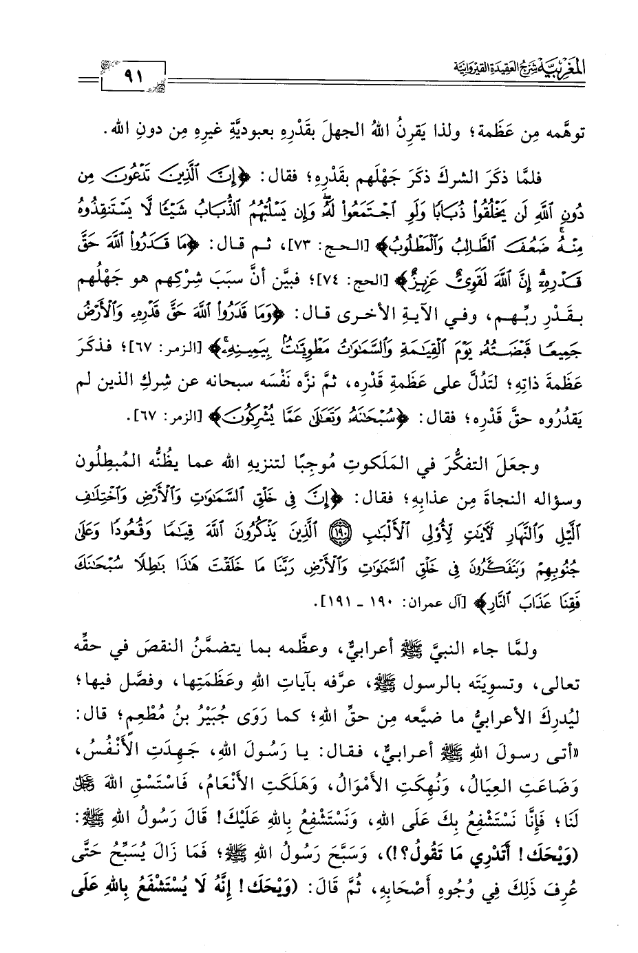 ولمَّا جاء النبيَّ -صلى الله عليه وسلم- أعرابيٌّ، وعظَّمه بما يتضمَّنُ النقصَ في حقِّه تعالي، وتسوِيَتَه بالرسول -صلى الله عليه وسلم-، عرَّفه بآياتِ اللهِ وعَظَمَتِها، وفصَّل فيها؛ ليُدرِكَ الأعرابيُّ ما ضيَّعه مِن حقِّ اللهِ؛ كما رَوَى جُبَيْرُ بن مُطْعِمٍ؛ قال: "أتى رسولَ اللهِ -صلى الله عليه وسلم- أعرابيٌّ، فقال: يا رَسُولَ الله، جَهِدَتِ الأَنْفُسُ، وَضَاعَتِ العِيَالُ، وَنُهِكَتِ الأَمْوَالُ، وَهَلَكَتِ الأَنْعَامُ، فَاسْتَسْقِ اللهَ -عز وجل- لنا؛ فَإِنَّا نَسْتَشْفِعُ بِكَ عَلَى الله، وَنَسْتَشْفِعُ بِاللهِ عَلَيْكَ! قَالَ رَسُولُ اللهِ -صلى الله عليه وسلم-: (وَيْحَكَ! أَتَدْرِي مَا تَقُولُ؟ ! )، وَسَبَّحَ رَسُولُ اللهِ -صلى الله عليه وسلم-؛ فَمَا زَالَ يُسَبِّحُ حَتَّى عُرِفَ ذَلِكَ فِي وُجُوهِ أَصْحَابِه، ثُمَّ قَالَ: (وَيْحَكَ! إِنَّهُ لَا يُسْتَشْفَعُ بِاللهِ عَلَى