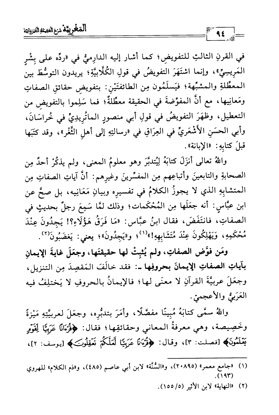 ومَن فوَّض الصفاتِ، ولم يُثبِتْ لها حقيقتَها، وجعَلَ غايةَ الإيمانِ بآياتِ الصفاتِ الإيمانَ بحروفِها -: فقد خالَفَ المَقصِدَ مِن التنزيل، وجعَلَ عربيَّةَ القرآنِ لا معنَى لها؛ فالإيمانُ بالحروفِ لا يَختلِفُ فيه العَرَبيُّ والأعجميّ.