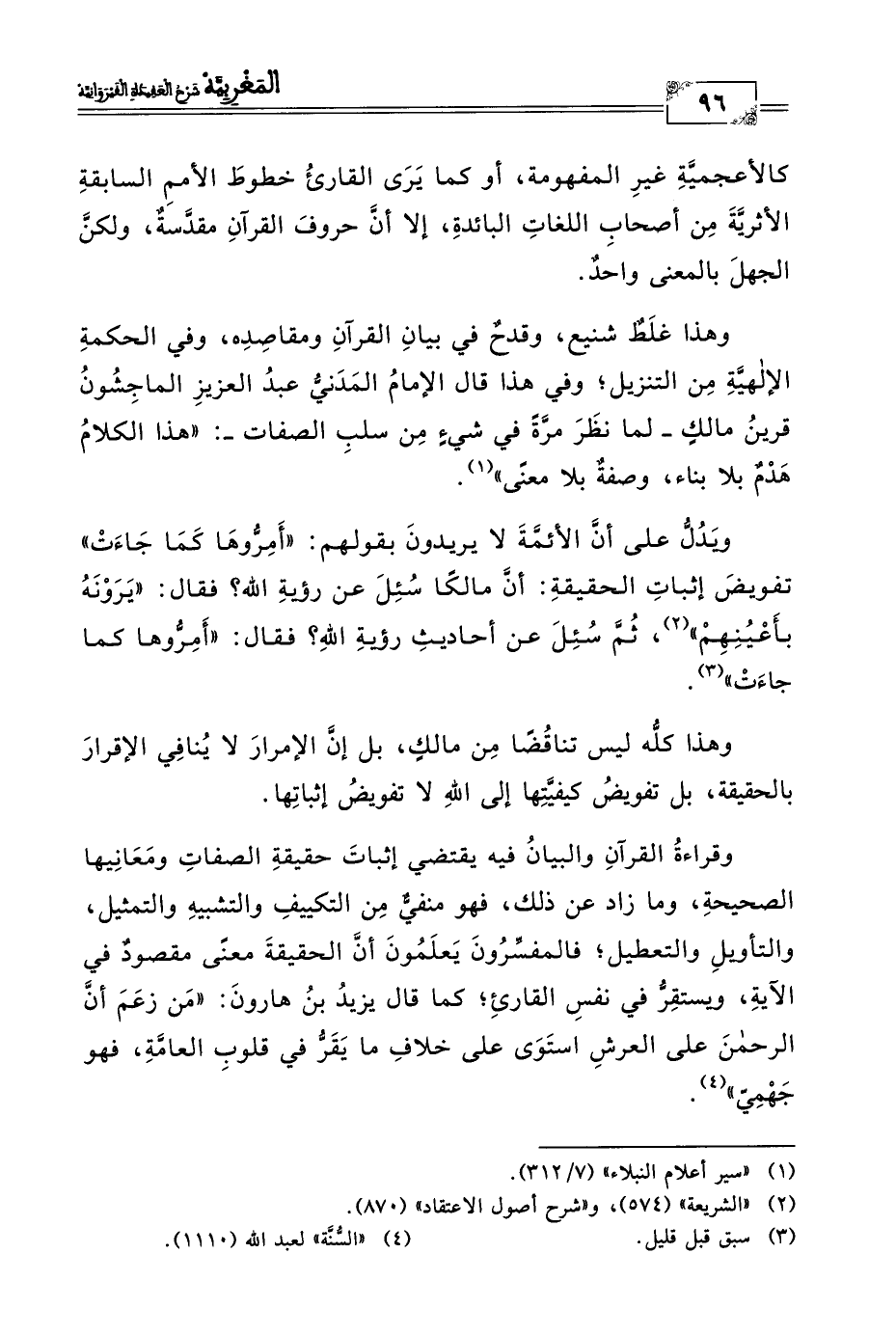 ويَدُلُّ على أنَّ الأئمَّةَ لا يريدونَ بقولهم: "أَمِرُّوهَا كَمَا جَاءَتْ" تفويضَ إثباتِ الحقيقةِ: أنَّ مالكًا سُئِلَ عن رؤيةِ الله؟ فقال: "يَرَوْنَهُ بأَعْيُنِهِمْ" (٢)، ثُمَّ سُئِلَ عن أحاديثِ رؤيةِ اللهِ؟ فقال: "أَمِرُّوها كما جاءَتْ" (٣).