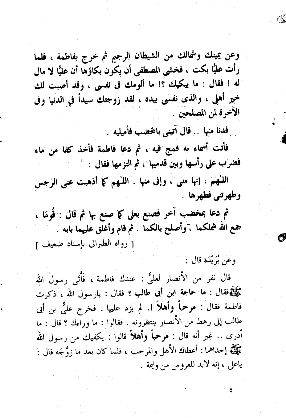 رواه الطبراني بإسناد ضعيف وعن بريدة قال: قال نفر من الأنصار لعلي: عندك فاطمة، فأتى رسول الله صلى الله عليه وسلم فقال: ما حاجة ابن أبي طالب؟ فقال: ارسول الله، ذكرت فاطمة فقال: مرحبا وأهلا!. لم يزد عليها. فخرج علي بن أبي طالب إلى رهط من الأنصار ينتظرونه. فقالوا: ما وراءك؟ قال: ما أدري..غير أنه قال: مرحبا وأهلا قالوا: يكفيك من رسول الله صلى الله عليه وسلم إحداهما: أعطاك الأهل والمرحب، فلما كان بعد ما زوجه قال: يا علي، إنه لا بد للعروس من وليمة.