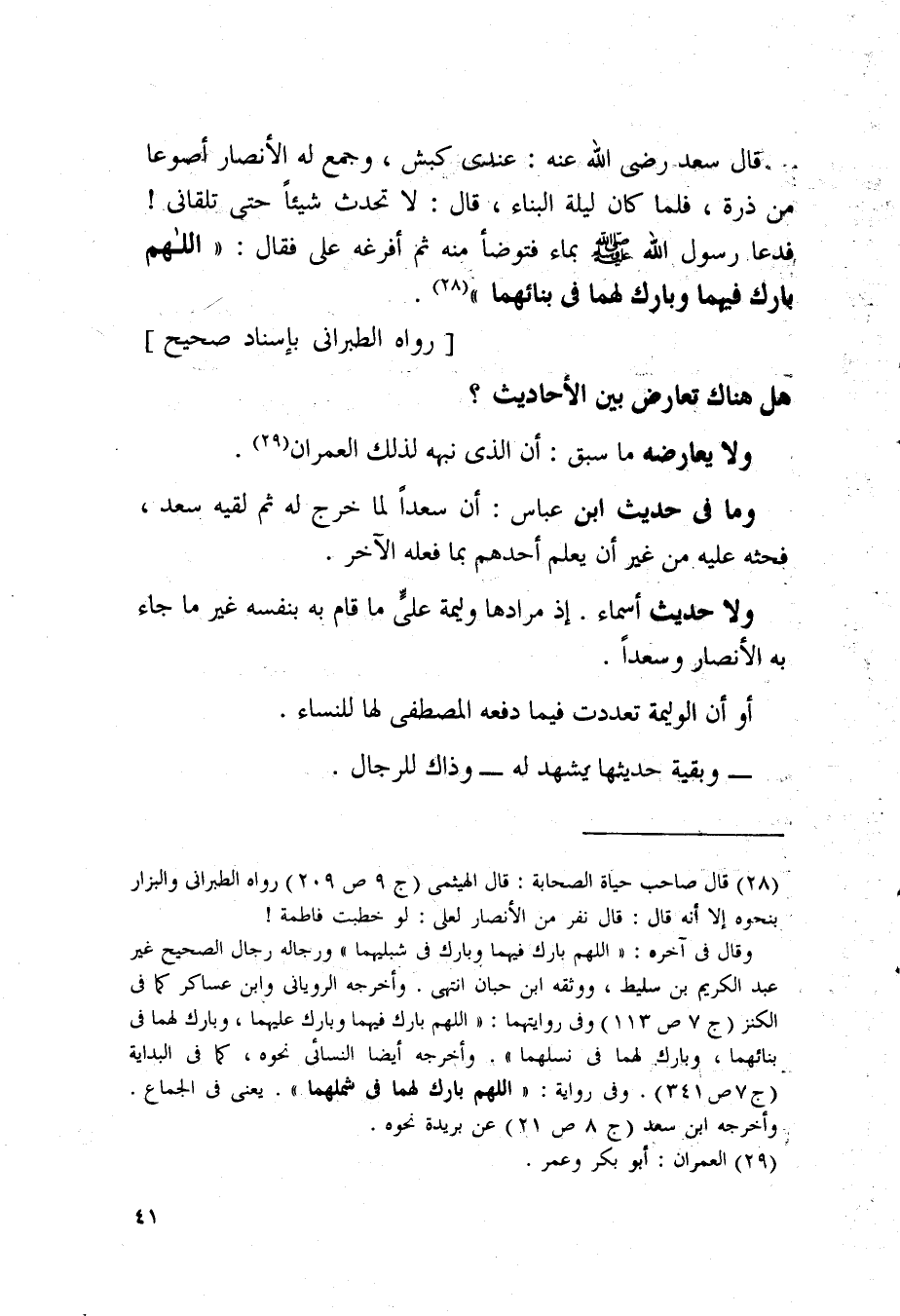 قال سعد رضي الله عنه: عندي كبش، وجمع له الأنصار أصوعا من ذرة، فلما كان ليلة البناء، قال: لا تحدث شيئا حتى تلقاني! فدعا رسول الله صلى الله عليه وسلم بماء فتوضأ منه ثم أفرغه على فقال: (اللهم بارك فيهما وبارك لهما في بنائهما) .