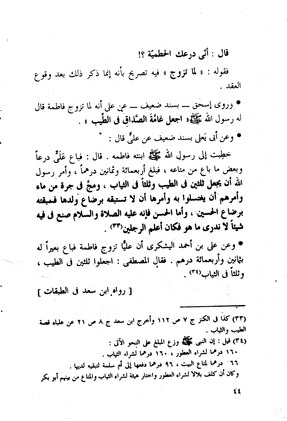 وعن علي بن أحمد اليشكرى أن عليا تزوج فاطمة فباع بعيرا له بثمانين وأربعمائة درهم. فقال المصطفى: اجعلوا ثلثين في الطيب، وثلثا في الثياب.