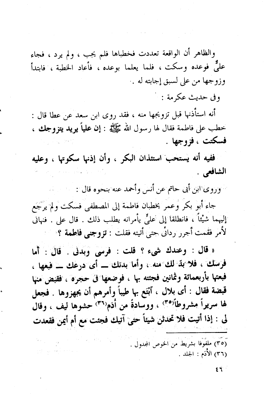 وروى ابن أبي حاتم عن أنس وأحمد عنه بنحوه قال: جاء أبو بكر وعمر يخطبان فاطمة إلى المصطفى فسكت ولم يرجع إليهما شيئا، فانطلقا إلى علي يأمرانه يطلب ذلك. قال على. فنهاني لأمر فقمت أجرر ردائي حتى أتيته فقلت: تزوجني فاطمة؟ (قال: وعندك شيء؟ قلت: فرسى وبدني. قال: أما فرسك، فلا بد لك منه، وأما بدنك - أي درعك - فبعها، فبعتها بأربعمائة وثمانين فجئته بها، فوضعها في حجرة، فقبض منها قبضة فقال: أي بلال، ابتع بها طيبا وأمرهم أن يجهزوها. فجعل لها سريرا مشروطا، ووسادة من أدم حشوها ليف، وقال لي: إذا أتيت فلا تحدثن شيئا حتى آتيك فجئت مع أم أيمن فقعدت