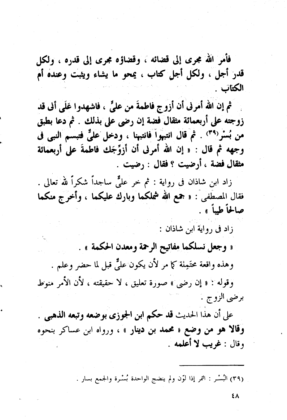 ثم إن الله أمرني أن أزوج فاطمة من علي، فاشهدوا على أني قد زوجته على أربعمائة مثقال فضة إن رضي على بذلك. ثم دعا بطبق من بسر. ثم قال انتبهوا فانتبهنا، ودخل علي فتبسم النبي في وجهه ثم قال: (إن الله أمرني أن أزوجك فاطمة على أربعمائة مثقال فضل، أرضيت؟ فقال: رضيت.