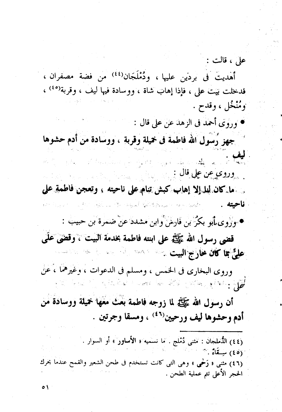 وروى البخاري في الخمس، ومسلم في الدعوات، وغيرهما، عن على: أن رسول الله صلى الله عليه وسلم لما زوجه فاطمة بعث معها خميلة ووسادة من آدم وحشوها ليف ورحيين، ومسقا وجرتين.