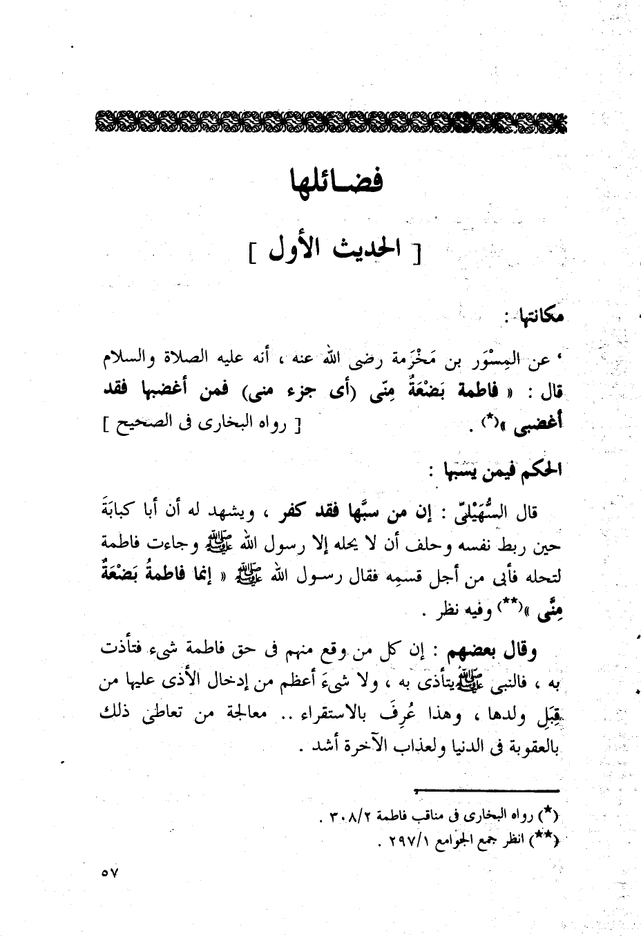 رواه البخاري في الصحيح الحكم فيمن يسبها: قال السهيلي: إن من سبها فقد كفر، ويشهد له أن أبا كبابة حين ربط نفسه وحلف أن لا يحله إلا رسول الله صلى الله عليه وسلم وجاءت فاطمة لتحله فأبى من أجل قسمه فقال رسول الله صلى الله عليه وسلم (إنما فاطمة بضعة مني) وفيه نظر.