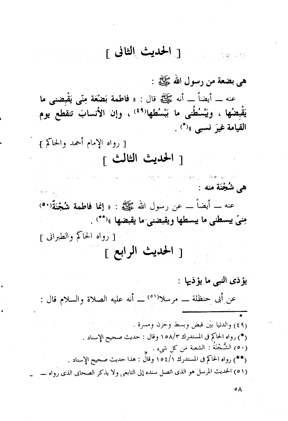 عنه - أيضا - عن رسول الله صلى الله عليه وسلم: (إنما فاطمة شجنة مني يبسطني ما يبسطها ويقبضني ما يقبضها) .