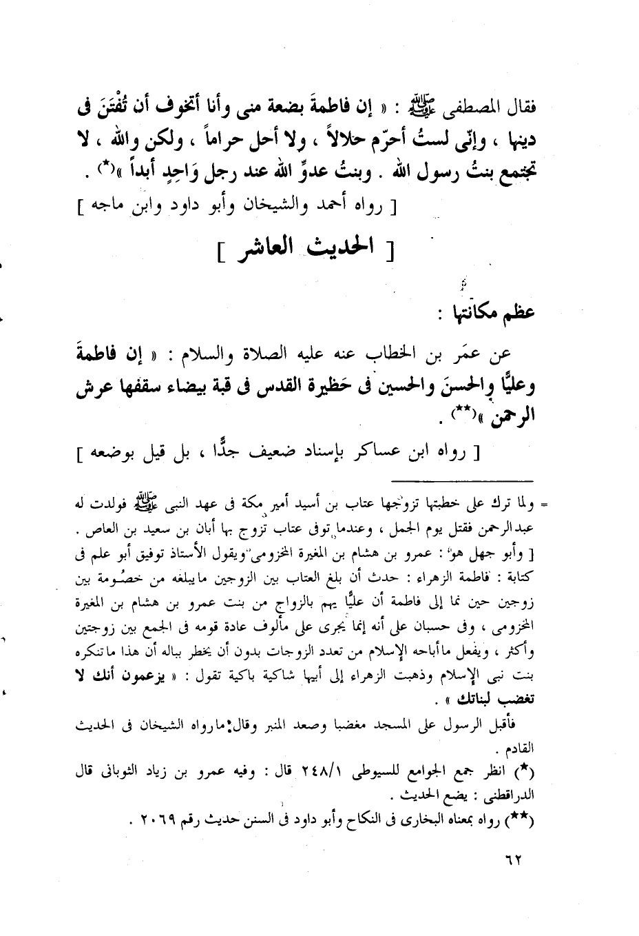 عن عمر بن الخطاب عنه عليه الصلاة والسلام: (إن فاطمة وعليا والحسن والحسين في حظيرة القدس في قبة بيضاء سقفها عرش الرحمن) .