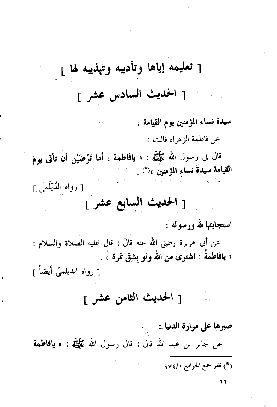 عن فاطمة الزهراء قالت: قال لي رسول الله صلى الله عليه وسلم: (يا فاطمة، أما ترضين أن تأتي يوم القيامة سيدة نساء المؤمنين) .