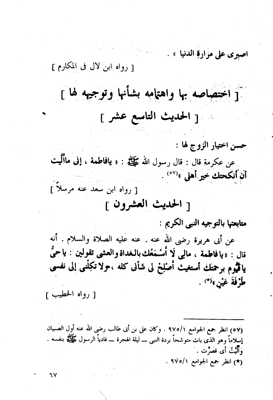 عن أبي هريرة رضي الله عنه. عنه عليه الصلاة والسلام. أنه قال: (يا فاطمة، ما لي لا أسمعك بالغداة والعشي تقولين: يا حي يا قيوم برحمتك أستغيث أصلح لي شأني كله، ولا تكلني إلى نفسي طرفة عين) .